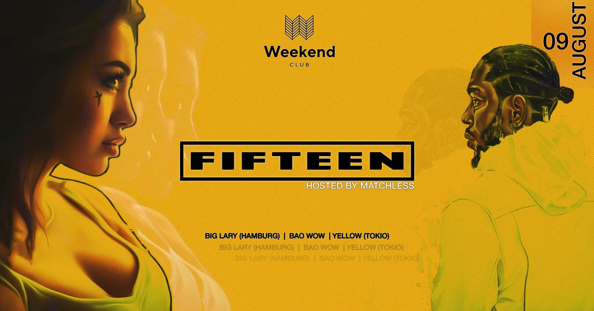 Fifteen hosted by DJ Matchless Friday, August 9, 2019 11:00 PM Saturday, August 10, 2019 6:00 AM Google Calendar ICS Fifteen hosted by DJ Matchless We want to create a spot for people with open minded visions of music & fashion. An esthetic look is an essential step to treat your body like it deserved. Be curious - be a part. Every Friday finest Hip Hop with best local and international DJs. More informations HERE