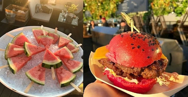 Weekend Spritz, strawberry daiquiri, pink burger and iced vodka melon on a stick provide for your physical well-being and a rosy complexion.