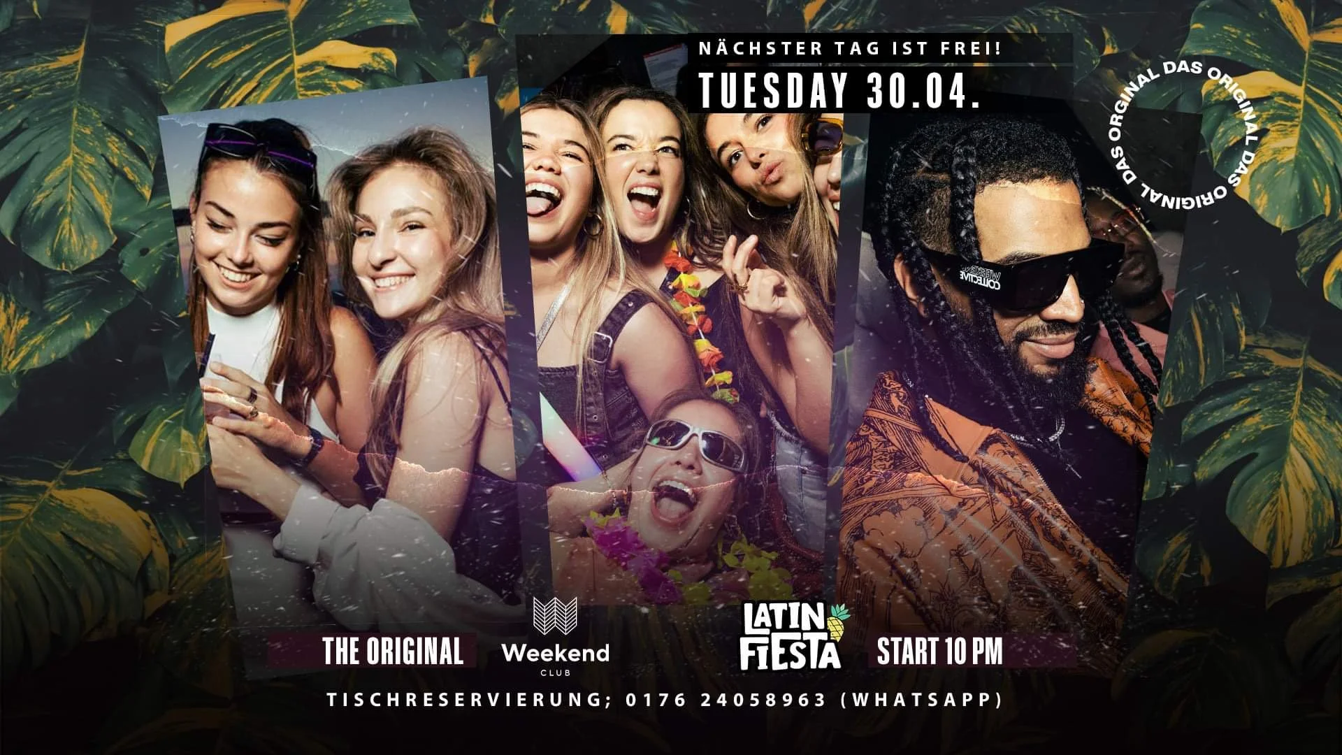 Tauche ein in die leidenschaftliche Welt von Latin Fiesta im Weekend Club und feiere das Feiertagsspecial am Dienstag, den 30. April(nächster Tag ist frei)!