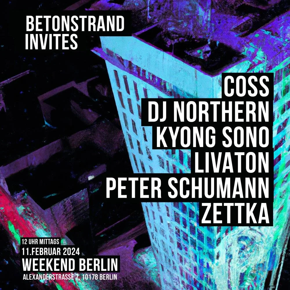 “Betonstrand invites” ist die neue Sonntags daytime Party in Berlin für alle, die qualitativ hochwertigen Techno lieben und die typischen Berliner Clubs alle schon durch haben. Venue ist das Weekend Berlin und wir sind seit langem die erste reine Techno Party, die dort wieder guten alten Zeiten aufleben lässt. Betonstrand ist ein Berliner Techno Label, dessen Mission es ist das Beste was der underground Techno zur Zeit zu bieten hat hinter die Decks zu holen. Gegründet in 2022 wollen wir unseren Künstler*innen, die bereits in der Berliner Techno Szene und weltweit etabliert sind, einen Rahmen bieten, in dem sie die Grenzen des Techno immer wieder neu erweitern können. Wir glauben, dass Techno mehr als Musik ist - Techno ist Kultur, Techno ist Lifestyle und bietet Möglichkeiten sich selbst auszudrücken.